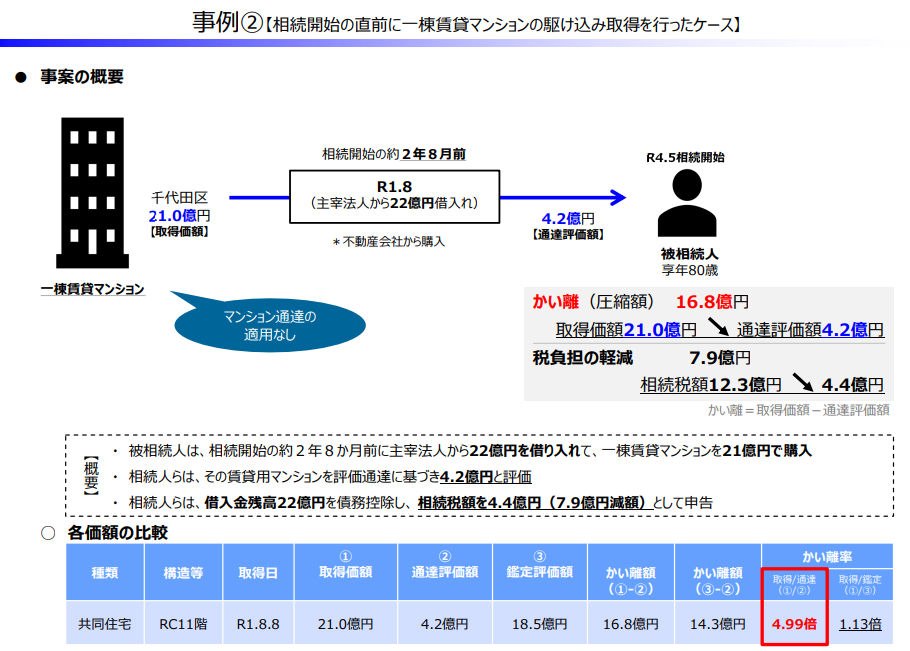 取得価額21億円の1棟賃貸マンションが相続税法の通達評価額では4.2億円と評価され、評価として16.8億円の乖離があり相続税が7.9億円減額された事例を紹介しています。