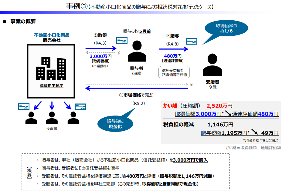 3,000万円で販売会社から購入した不動産小口化商品(賃貸用不動産を小口化したもの)を贈与した際に相続税法の評価通達では480万円と評価され、贈与税額が1,146万円減額されたのちに購入額と同額で小口化商品の販売会社に売却した事例を紹介しています。